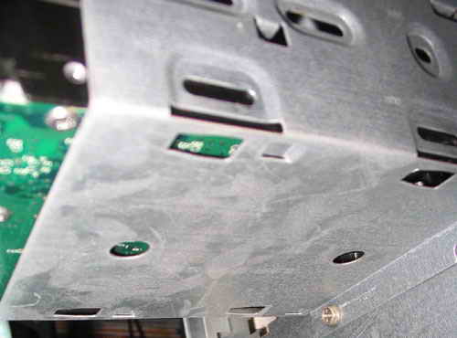 四、硬盤被放置在設備支架的最下方,也就是軟驅的下面。很明顯,硬盤上方的散熱空間已經被軟驅擋住,硬盤下方則因為有支架的底板支撐著(下圖),底板基本上把硬盤底座的散熱空間給封死了。難怪硬盤的黑色塑膠底盤會被熱得熔掉一部分,因為這樣的使用環境,硬盤下方的熱量根本就很難被導走。