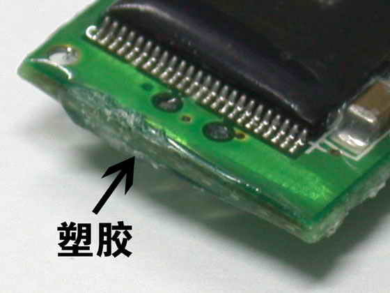 仔細觀察PCB電路板后,就可以發現原來美達海神二代鍍金版閃存盤所說的防水功能是將PCB電路板的表面裹了一層透明的塑膠實現的(如圖4)。