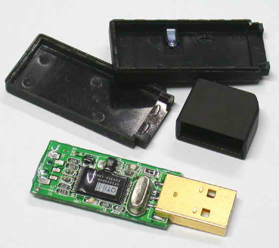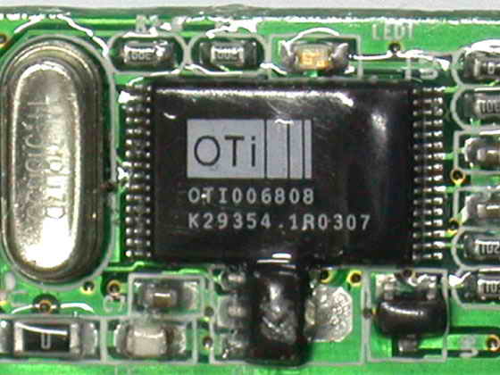 接下來,我們再來看看閃存盤的核心――控制芯片。閃存盤的讀寫速度、硬件功能(比如:啟動、硬件加密)全由這塊控制芯片所決定,它相當于整個閃存盤的神經中樞。常見的專業控制芯片廠商主要有:OTI、PROLIFIC、ST、CYPRESS、ICSI、3S等公司。其中最常見到的控制芯片是OTI 006803/006808和PROLIFIC PL2315控制芯片。海神二代鍍金版閃存盤是采用SOP(small outline package,小型外形封裝)封裝的OTI006808控制芯片(如圖6),這是基于USB 1.1標準的控制芯片。SOP封裝有更高的穩定性,適合更高的工作頻率。但是由于針腳的焊接工藝復雜,無法通過手工進行,只能通過專門的焊接機器進行操作。目前,也有一些低檔閃存盤的控制芯片是采用邦定(bonding)封裝。邦定封裝是一種比較古老的封裝形式,在一些早期的電子產品中我們可以經常看到采用該技術的芯片。邦定封裝的生產過程是將測試好的核心未經過封裝處理便直接焊接在PCB電路板上,然后將具有保護功能的有機材料融化覆蓋到芯片上作為封裝。由于封裝形式簡單(甚至收工都能完成),其成本會得到很大的降低。但其缺點就是用戶無法從外觀上了解控制芯片的廠家和規格。