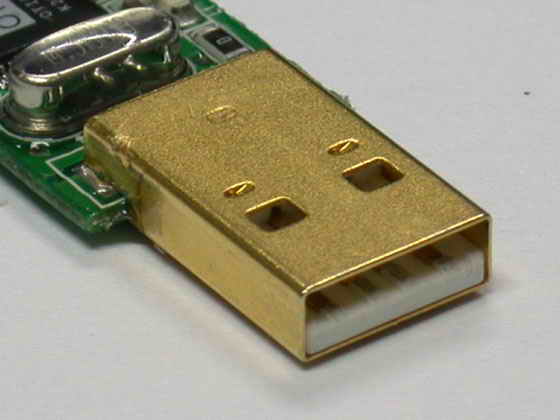 美達的海神二代鍍金版閃存盤,在黑色塑料外殼表面附著一層柔性材料,大大提升了防碰撞和抗摔能力。打開外殼后,除了金色的USB接口外,還可以發現正面的控制芯片和晶振,以及背面的閃存芯片(如圖3)。其他就什么都沒有了,結構非常簡單。