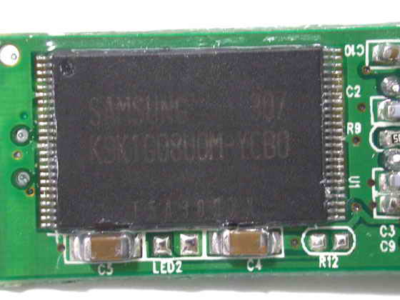 最后,我們就來看看閃存盤的大腦――閃存芯片。常見的閃存芯片廠商有SUMSUNG、TOSHIBA、FUJITSU、SANDISK等公司,而絕大多數閃存盤是采用SUMSUNG的閃存芯片。海神二代鍍金版閃存盤是采用一顆48TSOP1封裝、編號為K9K1G08U0M-YC80的SUMSUNG閃存芯片(如圖7)。這塊閃存芯片的規格為:128M×8bit、50ns速度,單顆容量128MB。工作電壓2.4~2.9V。