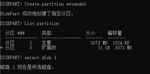 5、輸入Create partition extended,點擊回車鍵,剩余的磁盤空間全部劃分為擴展分區(qū)。