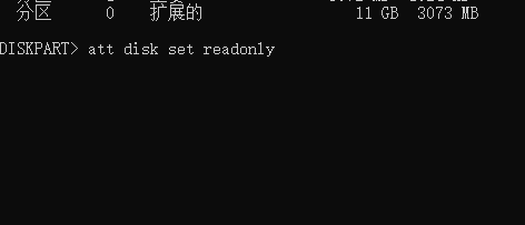 7、輸入att disk set readonly,點擊回車鍵,即可設(shè)置主分區(qū)只讀,這樣主分區(qū)后期就可以做為單獨的保護分區(qū),里面的文件都只能讀取無法刪除修改復制等。