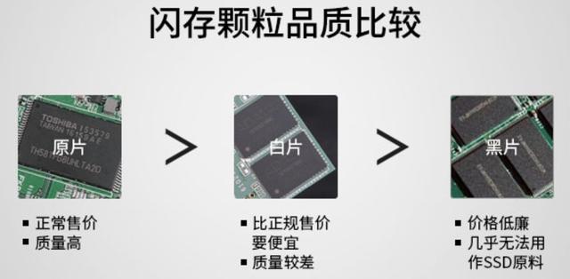 市面上還有一些使用“白片”、“黑片”顆粒的固態(tài)硬盤的廠家,“白片”是指原廠檢驗不合格的瑕疵品,被偷偷賣給下游工廠來制作固態(tài)硬盤。“黑片”是連白片都比不上的廢片,這類硬盤價格通常會遠低于原廠顆粒的硬盤,給人一種“高性價比”的錯覺。