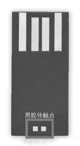 不過黑膠體有它的特殊性,它外觀上看不到FLASH芯片(或主控芯片)的數據腳,那它可以使用短接來初始化嗎?回答是可以。打開閃存盤外殼,仔細觀察,大家會發現黑膠體上有兩個觸點的(見下圖)。但是別急,因為僅短接這兩個觸點是不能完成初始化的,這點和普通閃存盤不同,我們需要做的是將觸點對地短接,而且請大家注意,只短接其中任意一個即可。