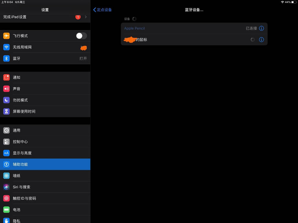 3、可以看到當前 iPad 已經連接了一個鼠標,如圖的示。值得一提的是,使用有線接入的鼠標也是可以的。比如第三代 iPad Pro 采用的是 Type-C 接口,可以通過它外接鼠標。