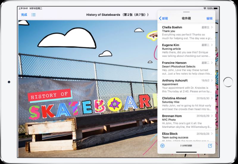 通過將屏幕拆分成可調整大小的視圖可打開兩個不同的 App 或同一 App 的兩個窗口。例如,在分屏瀏覽中同時打開“信息”和“地圖”?;蛘咴诜制翞g覽中打開兩個“信息”窗口,并同時管理兩個對話。