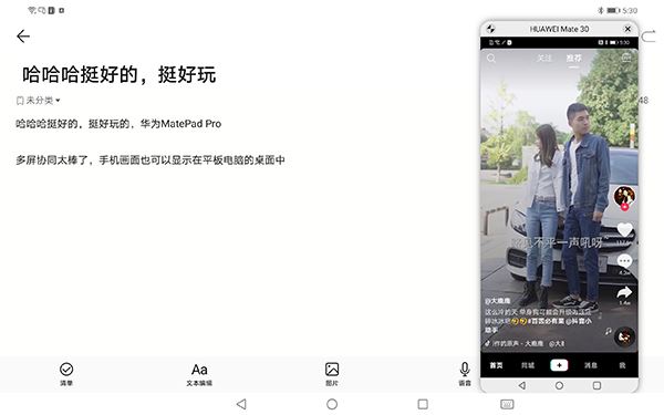 在多屏協(xié)同模式中,我們可以邊用華為MatePad Pro辦公邊用手機(jī)的屏幕進(jìn)行刷抖音、逛淘寶等操作。