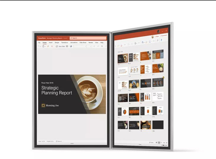 微軟設想人們在各種情況下使用這些設備,其中某些情況甚至與人們當前使用筆記本電腦的方式相同。你可以旋轉設備,應用程序和內容將智能地重排。微軟的Office應用程序甚至通過在PowerPoint中添加幻燈片列表之類的東西來巧妙地利用第二顯示屏。