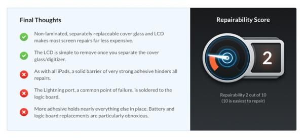 最終iFixit給出iPad 7修復(fù)性評分為2分(滿分為10分,分?jǐn)?shù)越高越容易修復(fù)),由此不難看出在修復(fù)方面,iPad 7還是有些難度的。iFixit表示可單獨(dú)更換防護(hù)玻璃以及LCD面板可以降低屏幕維修成本(畢竟很多時(shí)候我們都是摔壞了設(shè)備表層玻璃,而顯示模組未受影響);分開防護(hù)玻璃/數(shù)字轉(zhuǎn)換器后,LCD面板容易取下。