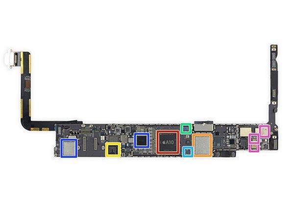在主板上包括以下模塊,紅色方框內(nèi)為Apple A10 Fusion APL1W24 SoC層置于Micron D9WQC 3GB LPDDR4 SDRAM上(內(nèi)存相比上代產(chǎn)品增加了50%);橙色方框內(nèi)為SanDisk SDMRSEFJ2 032G 32GB存儲(chǔ);黃色方框內(nèi)為Broadcom BCM15900B0觸摸屏控制器;綠色方框內(nèi)為NXP 100VB27 NFC控制器;青色方框內(nèi)為Cirrus Logic CS42L83A低功耗音頻編解碼器;藍(lán)色方框內(nèi)為蘋果343S00314-A0(PMIC)和Murata 339S00445 Wi-Fi /藍(lán)牙模塊;紫色方框內(nèi)為Skyworks 850946、203153033561852和13790697311912。