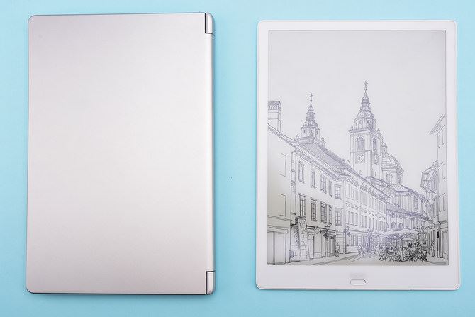 這個屏幕到底有多大呢?筆者特地拿了一款14英寸的筆記本放在一起對比,可以看到相比起BOOX MAX3的整個面積僅僅比傳統14英寸筆記本小了一些。大屏幕帶來的不僅是視覺感受的提升,在長時間的閱讀中相比起小屏幕的電紙書也是要更為護眼。