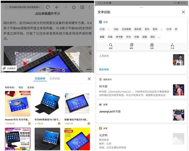 華為平板M6的智慧視覺(HiVision)也非常值得一提。在平板的桌面中部手勢下拉喚起搜索界面,界面右上角的圖標就是智能識物的入口。在智能識物里可以進行掃碼,文字翻譯,購物,掃描識別卡路里以及識物功能。智慧視覺的加入,可以說實現了“哪里不會掃哪里”的操作:看見喜歡的東西,掃一掃就能前往商城加入購物車;遇見不認識的單詞,掃一掃就能翻譯;遇見新奇的花草樹木,掃一掃進入百科;吃飯的時候掃一掃,對自己今日攝入卡路里也可以更有概念。