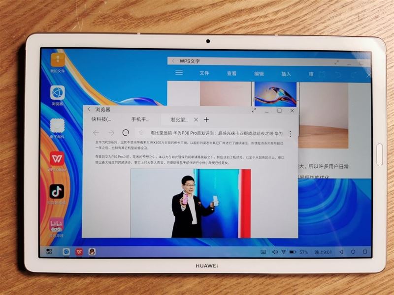 10.8英寸華為平板M6具備"電腦模式",在開啟該模式后,我們可以看到熟悉的類PC桌面的界面,WPS、文件管理器等辦公應(yīng)用已經(jīng)在桌面上待命。