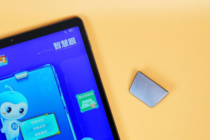 這里首先要裝上標(biāo)配的智慧眼,因?yàn)橛写盼O(shè)計(jì),所以靠近前置攝像頭就會(huì)自動(dòng)吸附并開(kāi)啟點(diǎn)問(wèn)模式。通過(guò)智慧眼的反射,前置攝像頭能夠在A4紙范圍內(nèi)準(zhǔn)確識(shí)別大小約3.16毫米的小五號(hào)字,配合指尖定位和定制OCR技術(shù),步步高家教機(jī)S5就“看到”指著的知識(shí)點(diǎn)了。