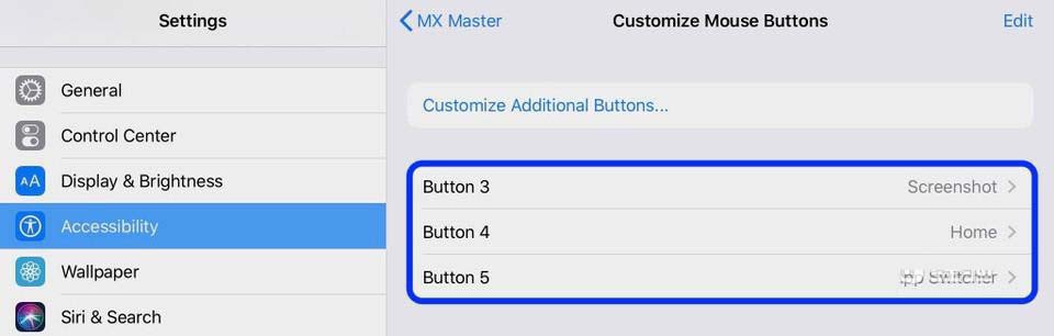6、選擇自定義鼠標按鈕,你可以點擊想要定制的鼠標按鍵,從列表中選擇想要賦予其的快捷操作功能,比如側鍵進入后臺、中鍵鎖屏等。iPadOS 支持多個快捷鍵按鈕,可根據你的鼠標具體情況定制。在輔助觸控設置頁的下面還可以調整鼠標指針移動速度,也可以選擇是否始終顯示菜單。