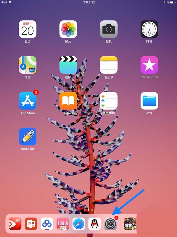 1、首先我們進入ipad的桌面。找到iPad設置,點擊進入設置界面。如下圖