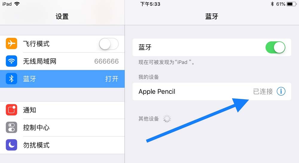 5、這樣你的iPad與apple pencil就會自動連接了。可以在如下界面看到apple pencil已連接。如下圖所示。