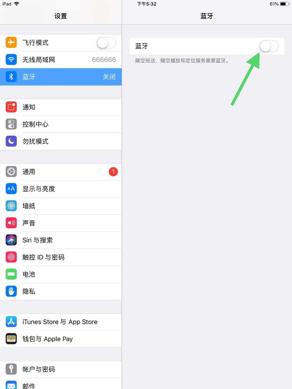 2、在設置界面中我們可以點擊進入藍牙選項。我們可以看到此時藍牙是未打開的。由于apple pencil與iPad連接需要打開藍牙,所以我們首先點擊藍牙將其打開。如下