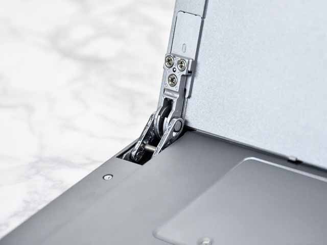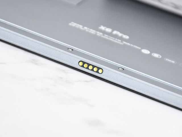 在平板底部,有特制的鍵盤接口,可以將鍵盤吸附在平板底部,合上則是平板保護套,展開則是鍵盤,由于我們沒拿到平板配的鍵盤,大家可以參考下Suface Pro系列的鍵盤設計,基本上是相同的。
