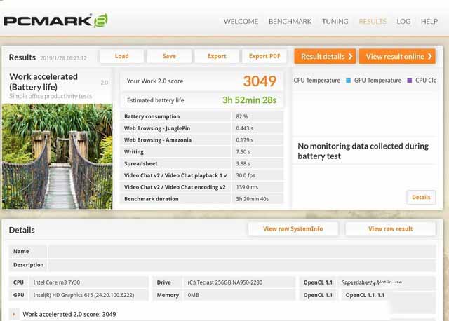 我們用PCMark8對續航進行了實測,在工作情景下,測試成績為3小時52分。但考慮到PCMark續航測試對電池的壓力是比較大的,正常使用時,續航時間還會多出不少。可以說,這個續航已經足夠出差辦公和娛樂使用了。