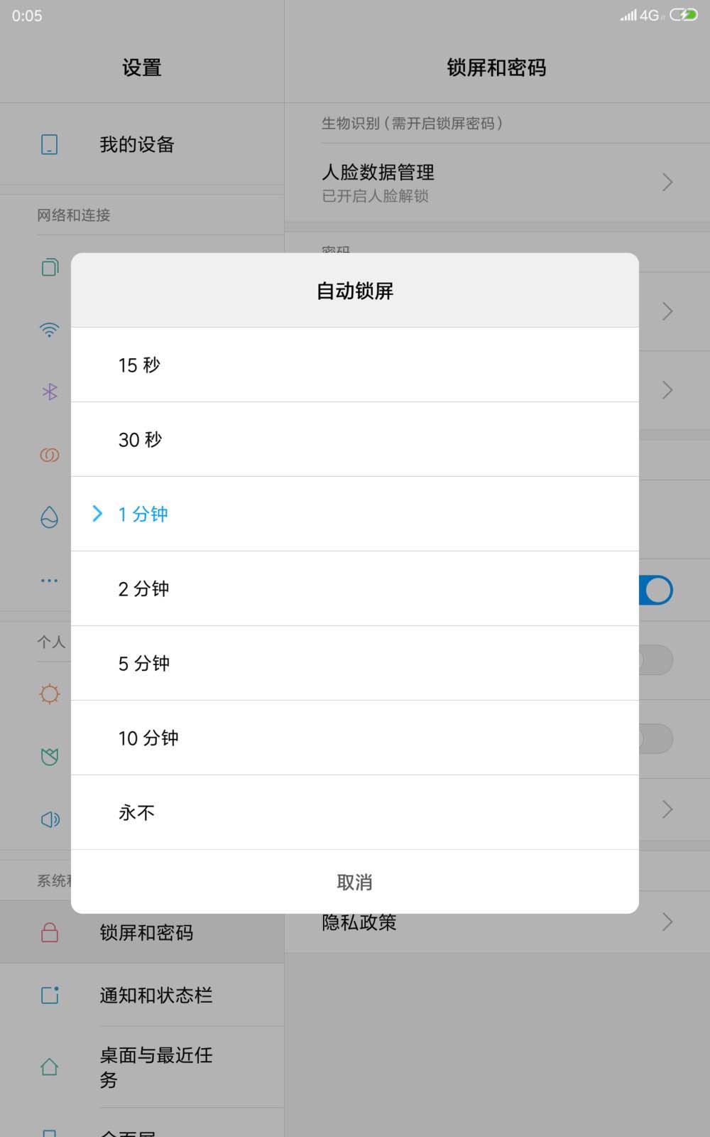 4、在打開的列表當中,我們可以看到,有不同的鎖屏時間可供我們進行選擇,我們選擇最后一個永不鎖屏