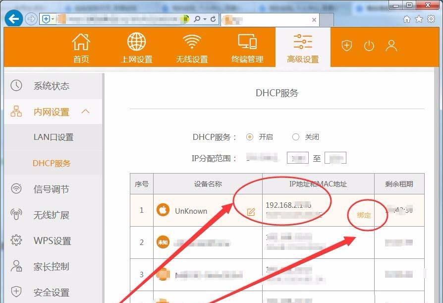 2、高級(jí)設(shè)置窗口中,選擇內(nèi)網(wǎng)設(shè)置選項(xiàng)中的DHCP服務(wù)選項(xiàng)。