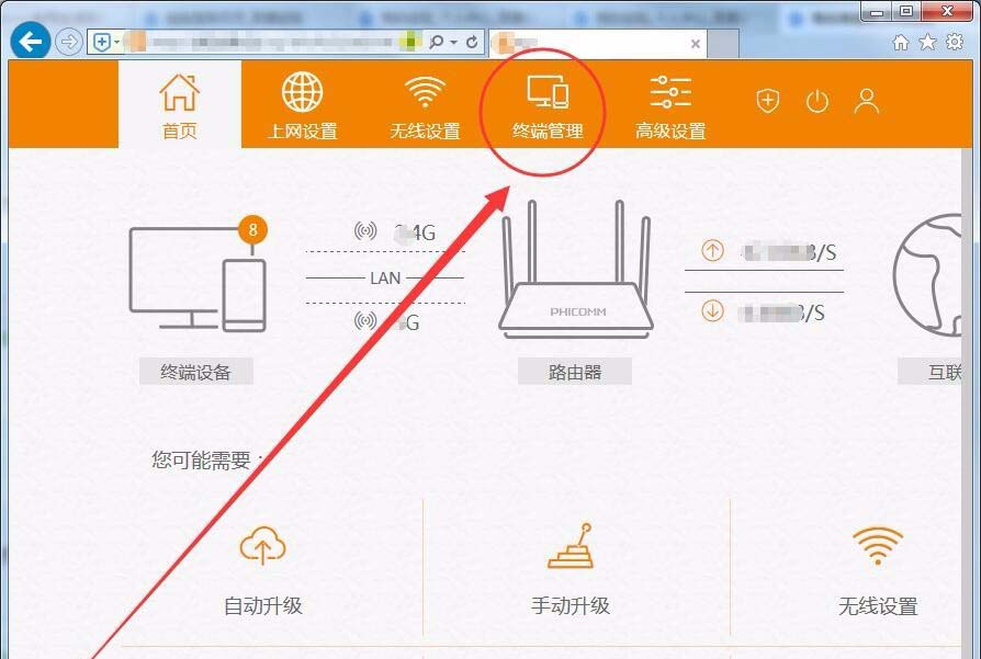 1、路由器設(shè)置界面中,選擇終端管理選項(xiàng)。