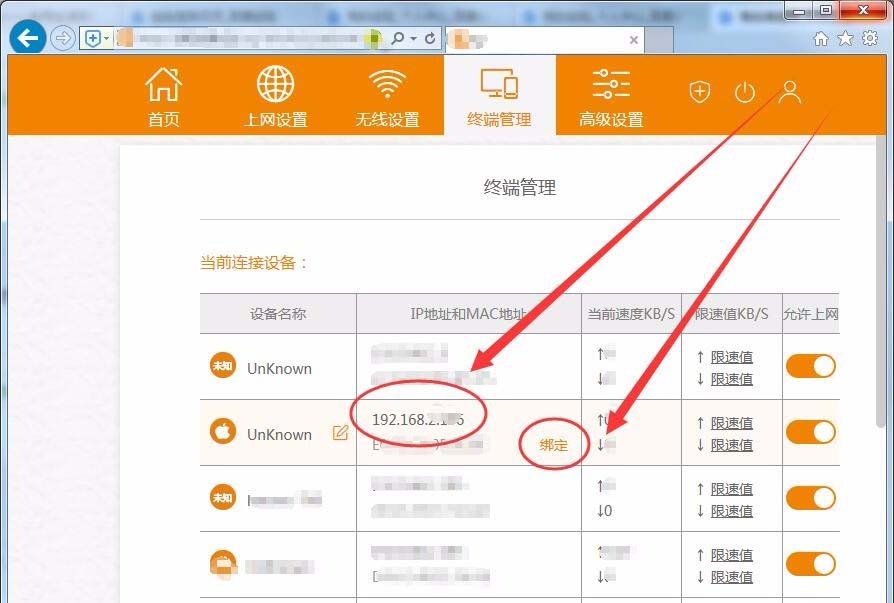 3、根據(jù)前面記錄的IP地址,找到要設(shè)置的平板設(shè)備,單擊其中的綁定選項(xiàng)。