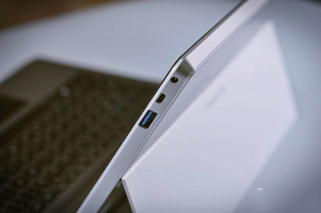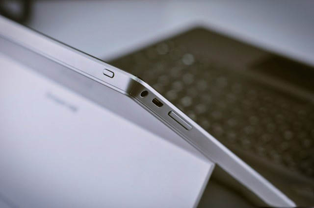 按照平時(shí)大家的使用習(xí)慣,絕大多數(shù)用戶都以右手為操作手,中柏EZpad 6 Plus將平板電腦常用接口設(shè)置在了右邊部分。其中包括DC電源、Micro USB、以及USB 3.0接口,由于平時(shí)經(jīng)常用優(yōu)盤進(jìn)行傳輸文件,因此USB接口放置在右側(cè),筆者在使用過程中非常順手。