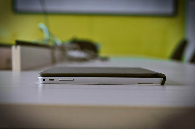 機(jī)身左上角集中有開關(guān)按鍵、3.5mm耳機(jī)接口、OTA接口和音量增減按鍵,平時(shí)如果鼠標(biāo)在占用一個(gè)USB接口的時(shí)候,可以將OTG線插入到MicroUSB接口上,接駁其他的USB設(shè)備。