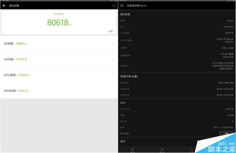在跑分測試中,小米平板 3 在安兔兔中可以跑出 8 萬分左右,和驍龍 650 基本相同,略低于驍龍 653。