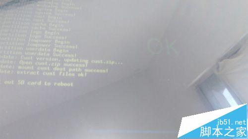 6、當出現安卓機器人之后可以看到綠色的英文,稍稍等待一會兒即可完成更換,界面上會出現大大的OK字樣表示已經成功