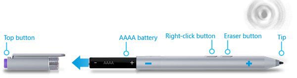 如果需要更換Surface Pen電池,擰開頂部部分,將一節AAAA電池放到Surface Pen內部即可,注意電池正極朝向筆尖一端,最后擰上頂部即可。