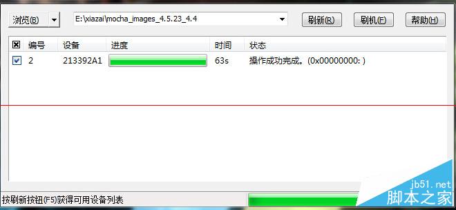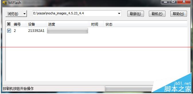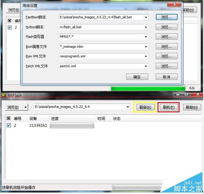 4、點擊黃色圈選部分刷新,刷機程序會自動識別手機,點擊瀏覽旁的向下箭頭,選擇高級設置--選擇fastboot刷機腳本為ROM路徑中flash_all.bat,點擊紅色圈選部分刷機開始刷機。