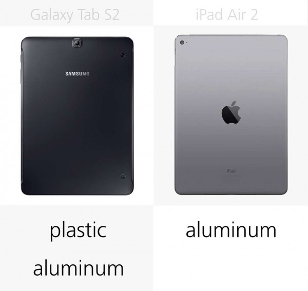 Galaxy Tab S2采用了金屬中框加塑料后蓋的方式,而iPad Air 2采用了完全鋁合金一體成型材質。