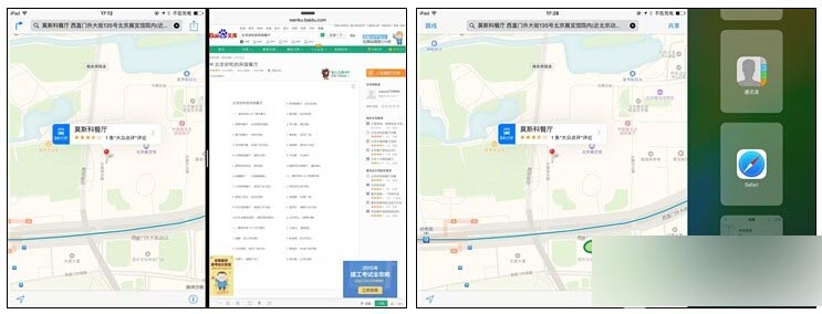 Split View可以讓iPad同時運行兩個應用,我們終于可以在iPad上一邊搜索有哪些好吃的餐廳一邊在地圖上找位置啦!當然,應用的場景遠不止吃這一項,像寫論文時查資料、聊天的時候看電影等等。現在兩個任務之間的比例只有5:5和7:3兩種(3:7都不行),整塊屏幕中以左屏幕為主,右屏幕可隨時調換,以上圖(左圖)為例,我們可以拖動右側屏幕上方的橢圓形按鍵將這個屏幕隨時變為小圖標形式并切換為其它應用。(該功能目前只能在iPad Air2實現)