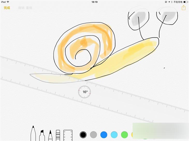 沒錯,你看到的并不是一個畫圖工具,而是備忘錄,我們終于可以在備忘錄中隨意寫、畫了,除了三種筆跡類型以外,還有平衡尺功能,當我們調出尺子的時候,尺子中心會顯示刻度,按住尺子兩端調整即可,不過提供的顏色現在貌似僅有這八種,給我們的感覺就像小時候買的那種5毛錢的蠟筆一樣,只有八種顏色可選,如果是顏色隨便選就更帥了!