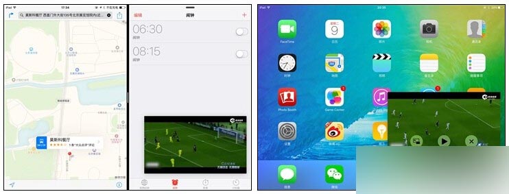 畫中畫功能也是本次升級中十分耀眼的一個功能,當你進行其它工作的時候,如果這時候正好趕上一場總決賽或者對你現在工作有幫助的實時新聞,畫中畫功能就能幫我們把視頻以縮小的模式放在屏幕上,屏幕的大小我們可以用雙指進行調節,視頻最大寬度支持半屏大小,最小寬度持四分之一屏幕大小,我們可以把它放在屏上除了中間以外的任何位置(單屏模式下也不能把視頻小窗口放在中間)。不過還有一點提醒大家,目前支持畫中畫的功能的視頻只有Safari中在線瀏覽的或者下載到本地以后用自帶的視頻軟件觀看的才可以,其它第三方軟件/客戶端暫不支持!(該功能該功能除iPad Air2以外iPad Air、iPad mini 2、iPad mini 3也都可以實現)