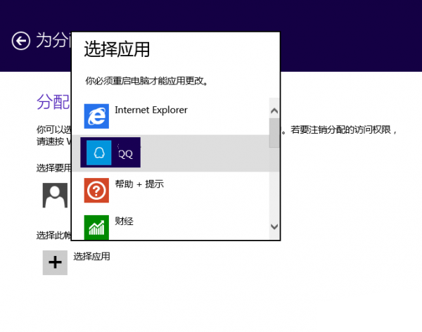 完成應用的安裝后注銷當前用戶,使用原來的賬戶進入系統,同上進入賬戶設置界面后點擊“為分配的訪問權限設置賬戶”,在打開的窗口選中“xhz”賬戶,點擊“選擇應用”,然后在彈出的應用列表里選擇QQ(圖9)。