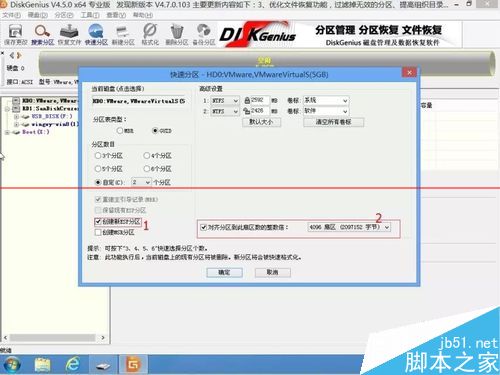 7、然后選擇“快速分區”分幾個區按個人喜好,分區的時候記得勾選“創建新esp分區”,“對齊分區的整數倍”選擇4096,然后點確定,如下圖: