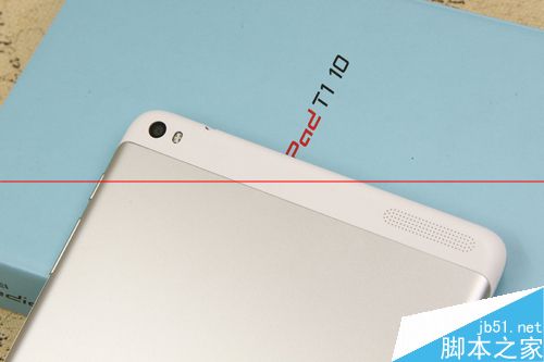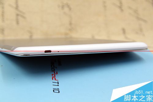 平板左側邊框空無一物,右側邊框靠上是電源鍵和音量鍵,靠下是SD卡插槽,采用隱藏式設計,要扣開卡槽保護蓋才能看到。機身頂部是耳機孔,底部是USB接口。