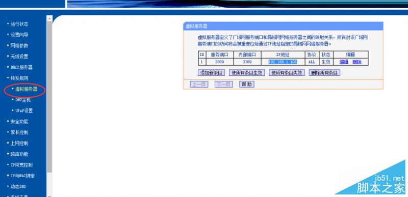 2)在轉(zhuǎn)發(fā)規(guī)則中,新增虛擬服務器。服務端口為3389,內(nèi)部端口號填空,IP地址填寫在PC端查詢出的IP地址,即路由器分配給PC的IP地址,協(xié)議選擇ALL,狀態(tài)選擇生效,常用服務端口號選擇空,保存。