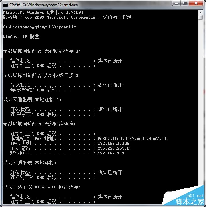 5)查看本機的IP地址。通過cmd命令框,輸入IPconfig命令即可查看。