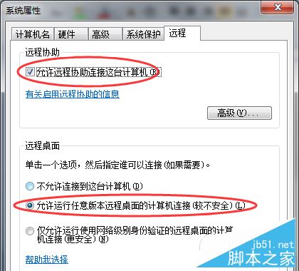 4)選擇遠程標簽,勾選“允許遠程協(xié)助連接這臺計算機”復選框,并將下面的“允許運行任意版本遠程桌面的計算機連接(較不安全)”選中,其他的默認即可。