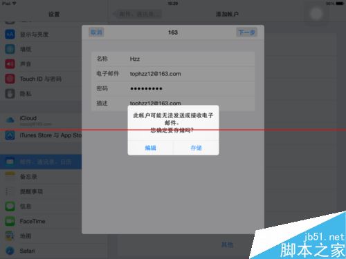 1、新買的IPAD,添加163郵箱的時候會出現這樣錯誤(添加方法的話大家應該都懂吧):“此賬戶可能無法發送或接受電子郵件”就算我強制點了還是要儲存,會出現無法取得郵件的情況。
