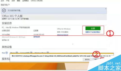 3、進入網頁,office365個人版,點擊安裝。過一會出現下載提示,點擊“運行”。