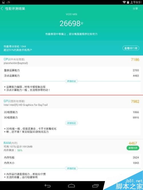 魯大師測試成績為26698分。CPU整體得分7186分,GPU整體得分7982分,ARM得分4467分。