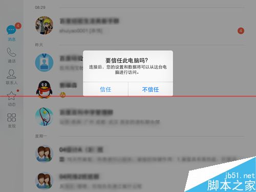 4、噔噔噔噔!!這是什么選項(xiàng)吖?不管是iPhone還是iPad,只要你更新到iOS8.2就有這個(gè)安全提示,基于安全性的考慮,你只有選擇信任,ipad才會(huì)開(kāi)放訪問(wèn)權(quán)
