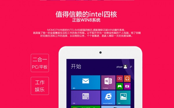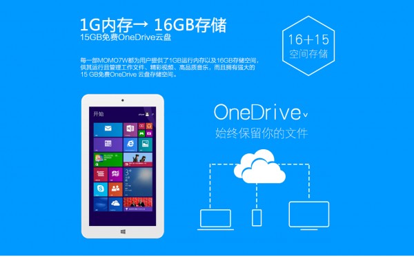 在造型方面,MOMO7W走的是簡潔純白路線,看上去絲毫廉價感。英特爾Baytrail-T最新64位凌動處理器,性能相比傳統32位處理器更高;配合1.33GHz的高主頻,MOMO7W可以為您帶來更快更極致流暢的系統操作感受、最迅速的觸控響應體驗。英特爾將第七代桌面顯卡Gen7移植平板,支持DirectX 11特效,讓游戲畫質完美釋放,性能更是以往主力多核安卓GPU(PowerVR SGX544MP2)的3倍以上 。購買MOMO7W可獲得15GB免費OneDrive云盤存儲空間,可獲得1年免費Office 365在線辦公服務訂閱。